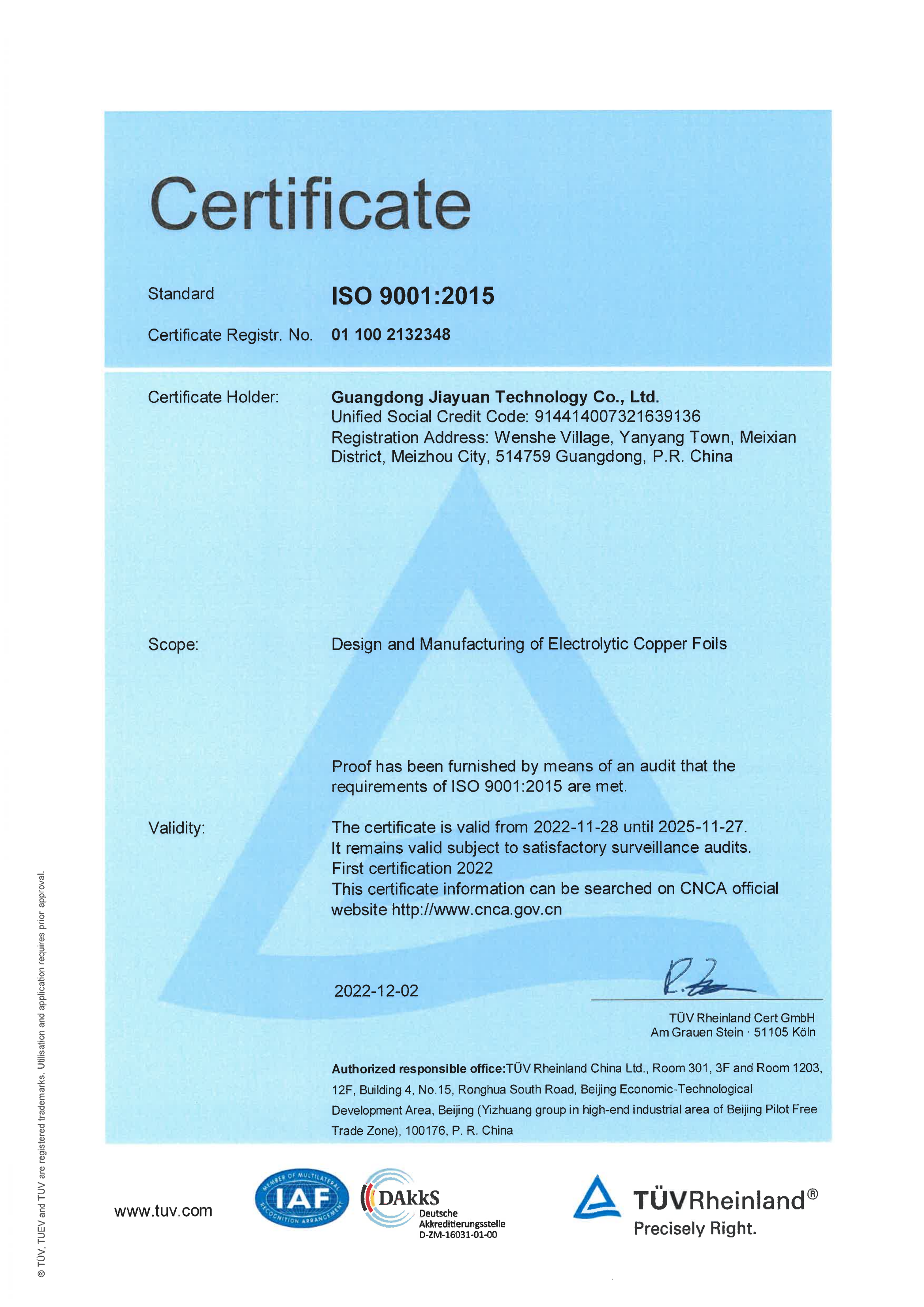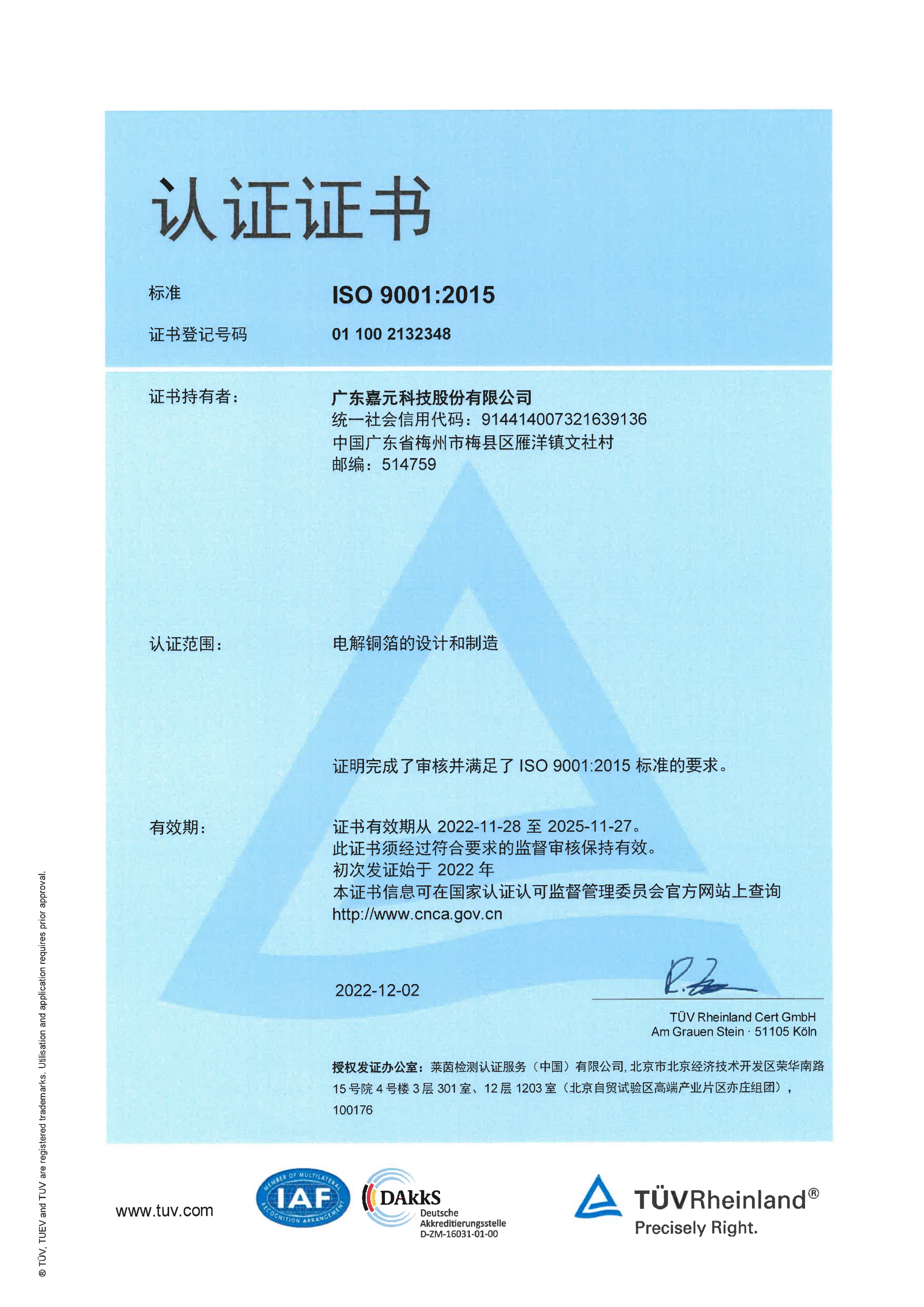 ISO 9001:2015認證證書